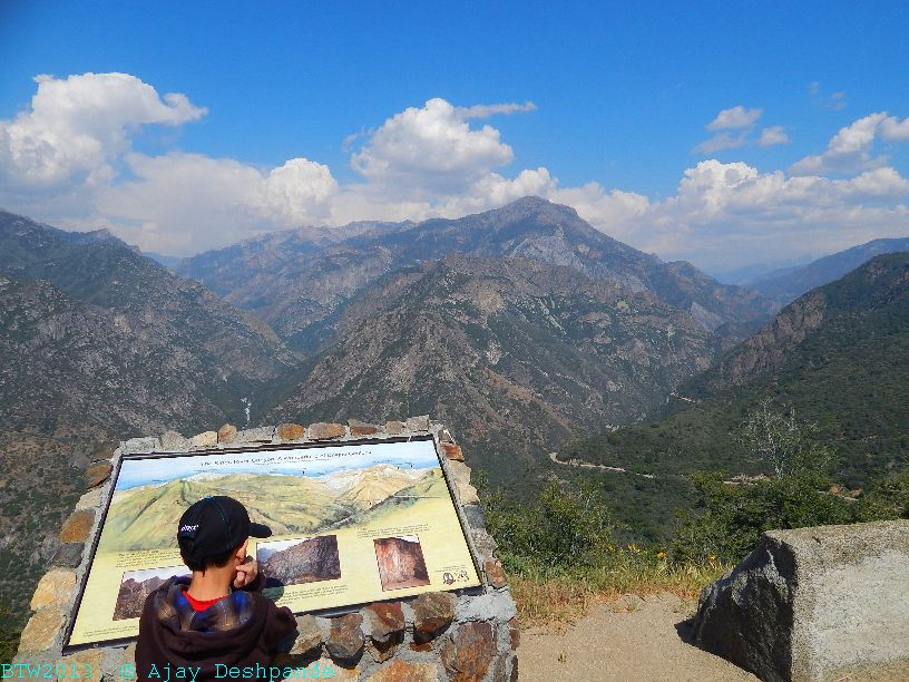 Arnav studies the write up on Kings Canyon that is seen beyond in the background |