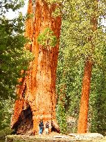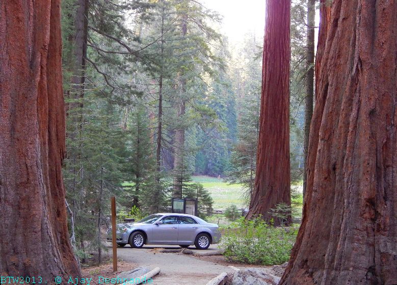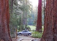 | A car parked amidst the giant Sequoias gives an idea of scale |
