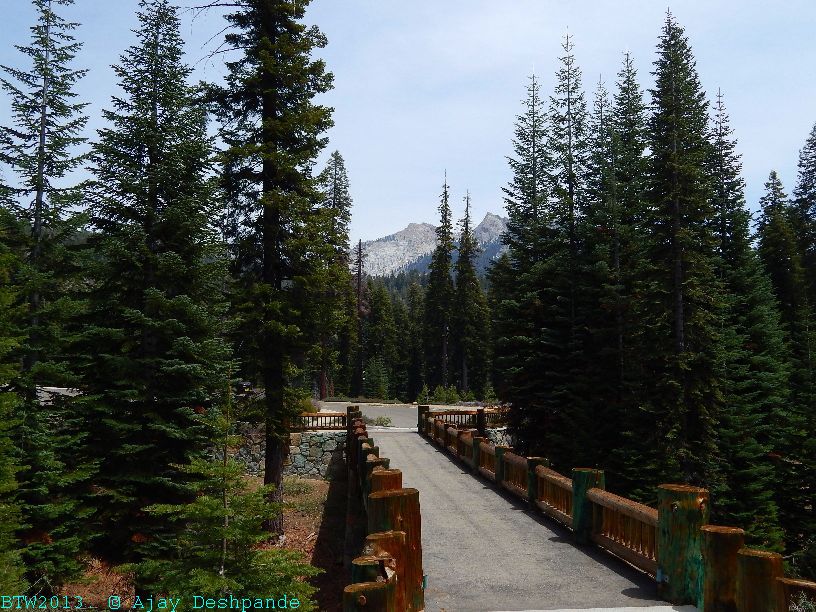Today's main course for the day is to explore the Sequoia National Park. Sequoia is the name of a tree, in fact a giant tree. Some of the sequoias here are as much as 2000 years old. And this forest obviously also boasts of some of the largest trees in the world. Our first stop for the day was the Lodgepole visitor center. This is a neat place that shows an orientation film about the Sequoias. Our next stop was at the Wuksatchi lodge. This is a trendy old place - remodelled to suit modern day needs. Its in a beautiful setting. From here we went on a hike that explores one of the local streams (the twin lakes trail). Some of the views along were breath taking. The air was mildly cold and very pleasant.