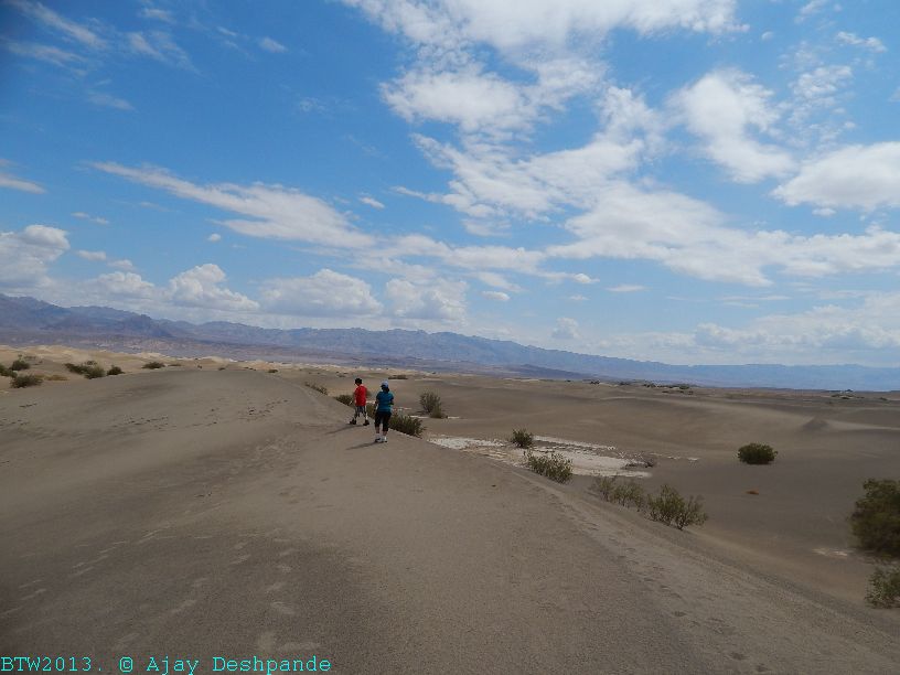 Our first stop in DVNP was at the Stovepipe wells for some coffee. This is a small place with a nice inn at the center. The most popular to thing to do here is the hike to the local Sand dunes. We spent a couple of hours running up and down the sand dunes. It was major fun. After this we drove down further south for lunch at Furnace Creek Ranch. Oh man we were hungry. This ranch is one awesome place - a true oasis in the DVNP desert. We had one heck of a lunch at this place. A veggie burger and a quesadilla were the main attractions. The Furnace Creek inn - also managed by the same company - is also close by and on the day we visited this place it clocked at $ 381 for the night's stay!!! We obviously did not stay there :).
