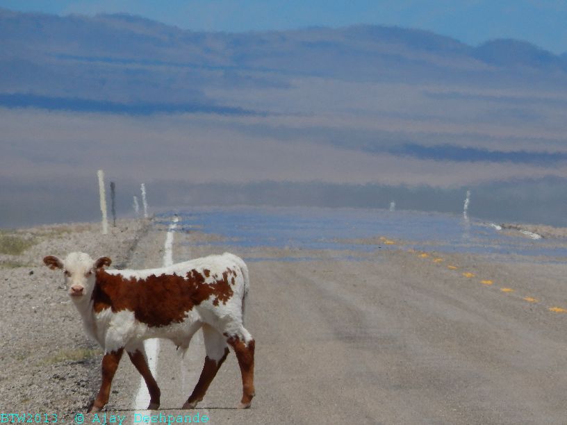 After Rhyolite we started on our long drive to Las Vegas (the straight route was like 100 miles, we drove around for about 250!). We took the circutous route to get a Nevada back country sampler. We drove past the US missle testing range, Area 51 as its called near the town of Tonopah in Nevada. It is part of folklore that Area 51 is where the US military stuff tests its new and funky stuff. This area sprawls for miles together of Nevada back country. The roads around here are some of the loneliest ones :). You could be lucky to see another vehicle cross you in a couple of hours. The landscape is small mountains, salt plains, brush vegetation, desert look for miles and miles. At times you can see your road for the next fifty miles or so without anything else in sight. At many places though we see cows wandering around. So we presumed there must be some ranches around.
