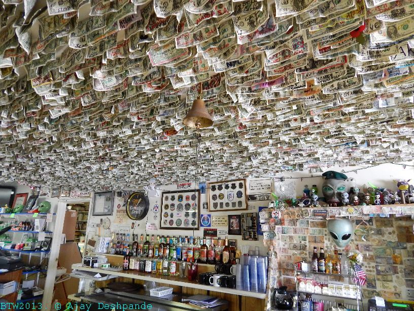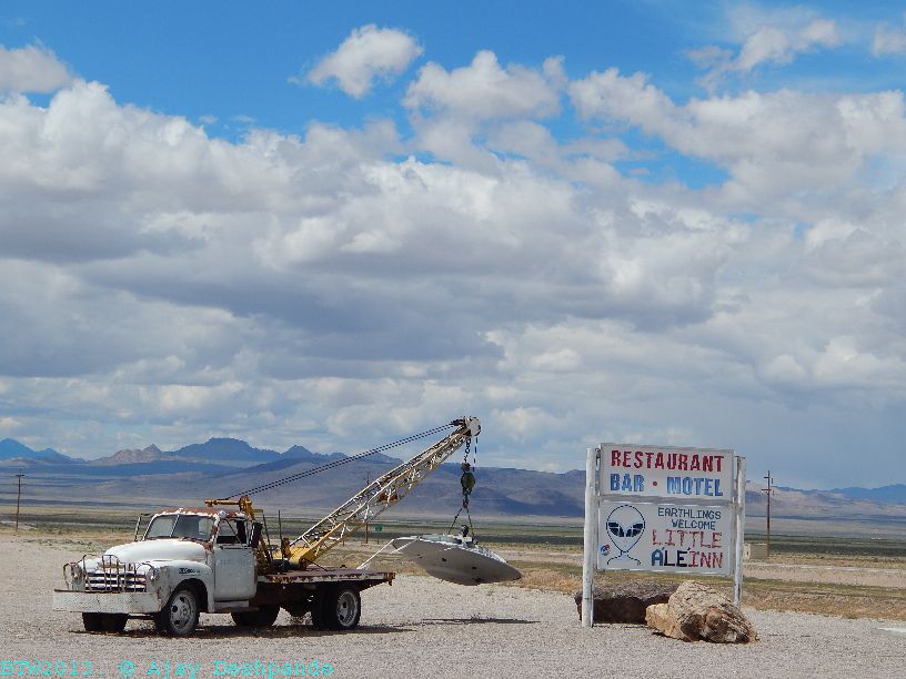 This is also the place where people have claimed to sight a lot of Unidentified Flying Objects !!!. That claim to fame goes to a small time town called Rachel in Nevada. That is where we stopped for lunch. Theres this small bar / restaurant / bistro place all rolled into one called Ale-Inn - it welcomes all Earthlings! A lot of interesting stuff going on around this restaurant. Good food too. Our stop there breaked the monotony of our drive.