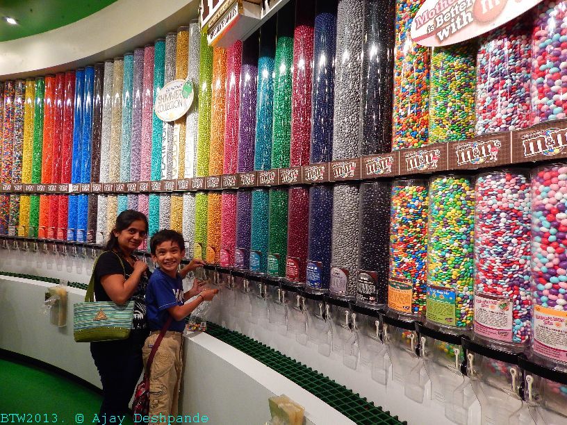 - The MnM store: MnMs are the US's gems that we get in India. If you are an MnM fan then this place is it. Its four storeys of fun with all goodies related to MnM. You get TShirts, caps, you name it... Two things stand out her - one you can personalize your MnMs. They actually print your name / word that you want on the MnMs you choose! The second thing is you have a huge array of MnM colors over a wall for kids to choose from! There is also a movie that runs for 10 minutes that is free and kids love it.