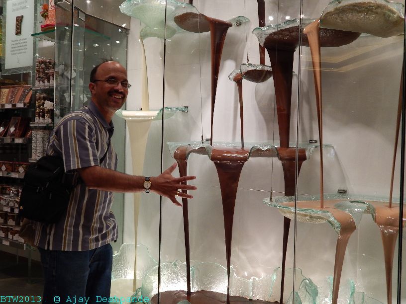 - Bellagio: This is the huge place that has the musical fountains in the front. The fountains run every half an hour or so... However the best part of this casino is the flower beds developed on the inside. Theres a nice butterfly garden in there and tons of flowers to enjoy. Add to that a huge chocolate fountain - three types of chocolates drip over glass surfaces over three stories. Oh man this was fun to watch. And then there are huge number of desserts you get out there... Chocolate lovers, rejoice!