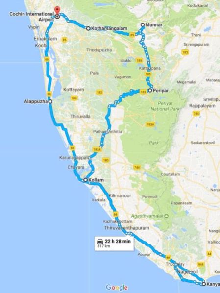 The map above gives you the route we followed: Cochin : Munnar : Thekkady : Kollam : Kanyakumari : Alleppey : Cochin.