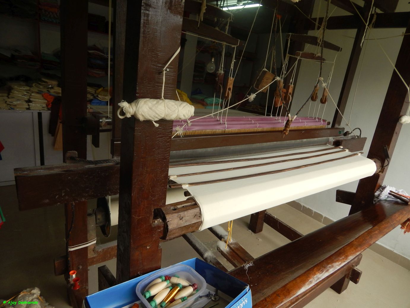 | The hand operated weaving machine at Kasavu Alayam (Kerala Silk) |