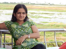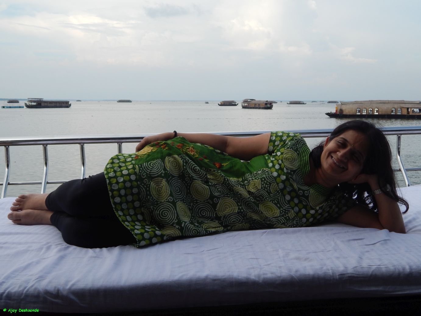 | Deepa strikes a pose as the boat floats by a marsh |