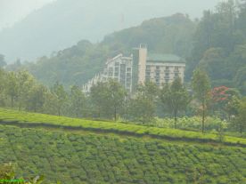 | A hotel rests amidst the tea gardens of Munnar |